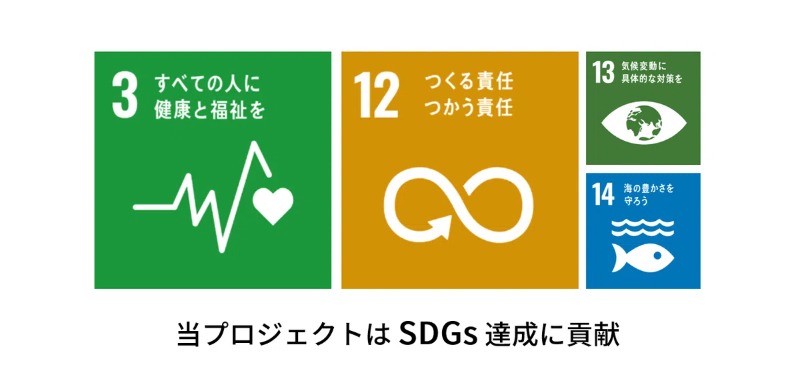 当プロジェクトは SDGsの 「3.すべとの⼈に健康と福祉を」「 12.つくる 責任つかう責任」「 13.気候変動に具体的な対策を」「 14.海の豊かさを守ろう」 にも該当し、私たちSDGsの達成に貢献もしています。